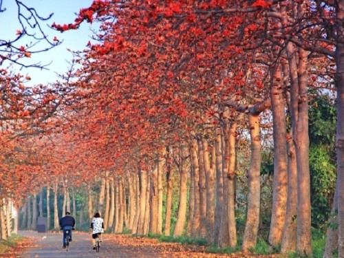 彰化县东螺溪,从埤头到二林段,沿虓阯`道路栽植长约5公里、600多株的木棉树,形成全国最长、最壮观的木棉花道,在三月春天火红绽放,交织成绵延的橘红隧道,埤头木棉花道和二林木棉花道相串联,缀满枝头的花朵,似火燃烧染红半边天,一侧有新绿水田衬托、一侧则倒映潺潺东螺溪,烘托出如|似幻的美景,吸引全国追花族;竹塘的木棉花秘境,规模较小,但得翻越堤防,深入田中央,别有一种隐密的氛围感,也成了春天最火红的景点。